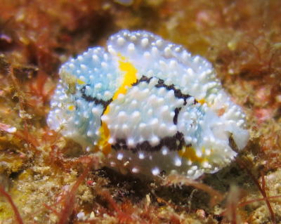 | そして、水深30m付近でOさんが発見の シモフリカメサンウミウシ〜っ!! ちゃーんと背中にカメさんがいましたよ(´∀`) 小さくて可愛い子でした! |