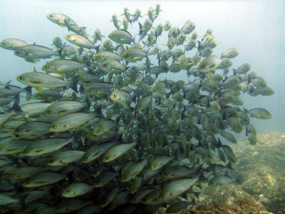 あちこちでキビナゴの群れに アタックするカンパチやツムブリの姿も見られました! グラスワールドの北の根では カンパチの群れがグルグルまわっていましたよ〜(^-^) |