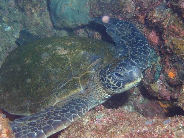 ![]() 日曜の最終便で、すでにお休みモードだったアオウミガメちゃん! 微動だにしませんでした(笑) |