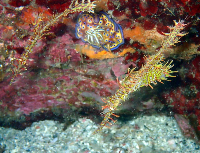 ![]() こちらも長い間、滞在中のニシキフウライウオのペアですが、 この日はオトヒメウミウシちゃんとコラボしてましたよ(^_-)-☆ そして、お腹の袋からは銀色の卵がチラリと♪ |