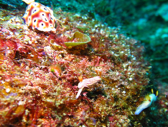 ![]() な、な、なんと1枚に写真に3種類ものウミウシが写り込んでいるっ! それだけウミウシがいっぱいってことです(^-^) |