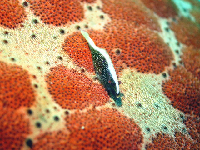 ヒトデヤドリエビがマンジュウヒトデの上を行ったり来たり! もう1匹いて追いかけっこしてるみたいです♪ 2匹仲良く暮らしてほしいなあ。。。 |