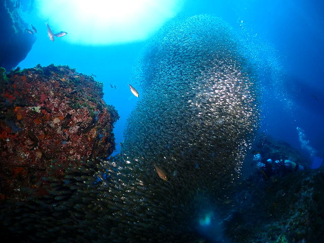 Uちゃんのお写真でーす\(^O^)/ このキンメモドキの群れは本当にすごいです! ここにカマスの子供も群れてきて、日に日に賑やかになってます。 青い海がさらに我々のテンションを高くしてくれますね♪ |