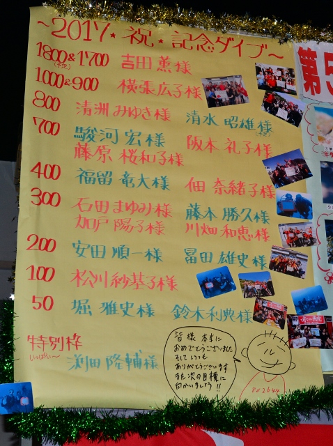 今年、当店及び赤鯱ダイビングサービスで記念ダイブを迎えていただいた リピーターの皆様です! 来年も楽しい記念ダイブを皆でお祝いしましょうね〜♪ 本当に皆様、おめでとうございます!! ![]() |