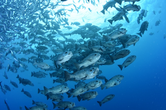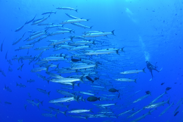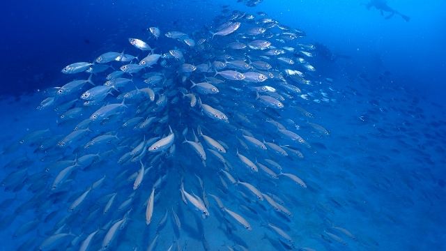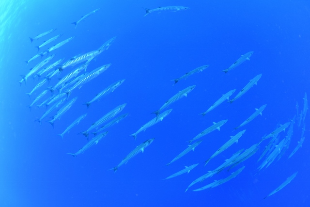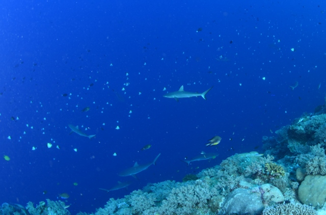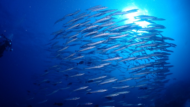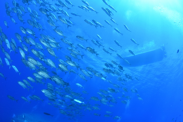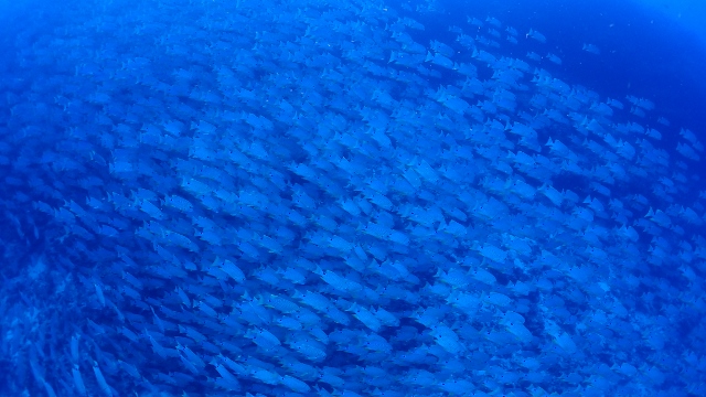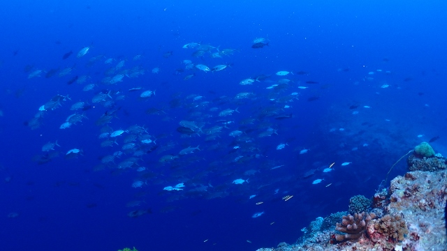 ![]() ペリリューの後は、ブルーコーナーへ! いい感じの上げ潮でフッキングして、ギンガメアジの群れを激写! |