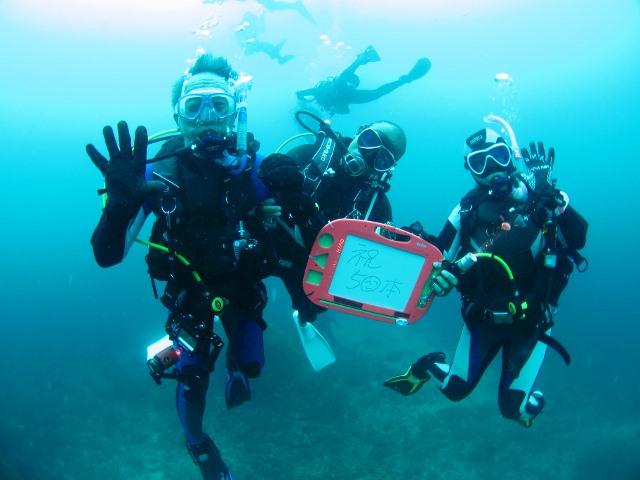 ![]() ということで、お二人揃って同じツアーで50本記念達成おめでとうございます! 100本は一緒のダイビングで迎えましょうか〜(笑) これからも楽しく&仲良く潜っていきましょう! |