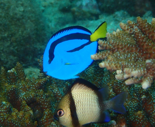 こちらはUちゃんが見つけて撮ってたドリーちゃん! フタスジリュウキュウスズメダイの子供と並んでいるのでサイズ感がよくわかります! |