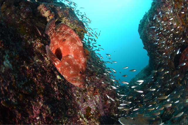 ![]() アザハタの根は、小魚の数は多くはありませんが、 かっこよく泳ぎ回る元気なアザハタさんの姿が! |