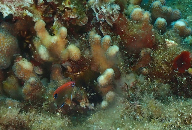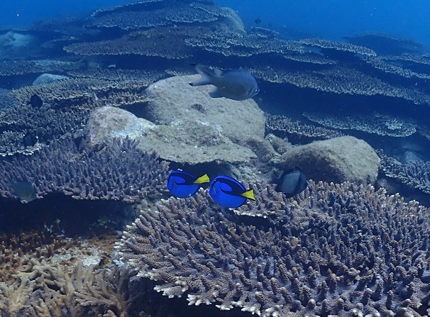 ![]() 浅場のサンゴエリアをプカプカしていたら、最後の最後にドリーのトリオを発見!! この写真は2匹ですが、3匹仲良くご飯を食べていましたよ! |