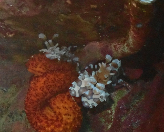 ![]() 大きなヒトデをつかんで離さない食いしん坊のフリソデエビのペアは 丸々と太っていましたよ(^_-)-☆ |