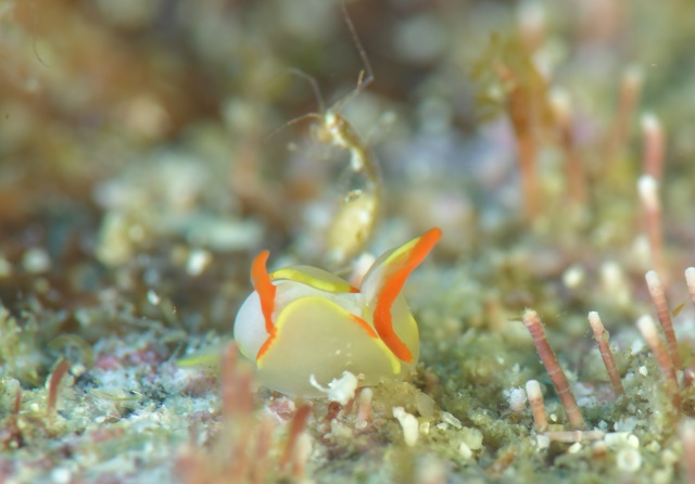 ![]() めちゃくちゃちっこいツノザヤウミウシちゃん(#^.^#) よーく見ると、ワレカラさんも一緒に写ってます! |