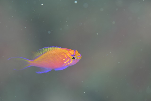 ![]() スズメダイの産卵行動も本格化してきました! ちょっと分かりにくいですが、左の子のお腹(腹ビレの少し前)に産卵管が!) |