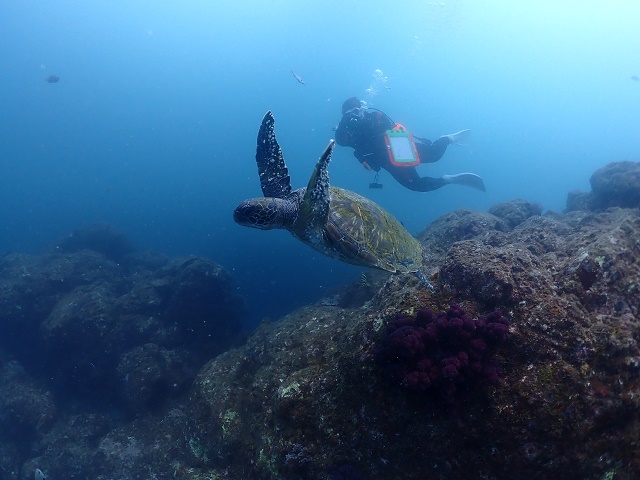 ![]() 見上げるとウミガメがスイスーイ!! お家に帰るのかと思いきや、水面へと旅立っていきました! |