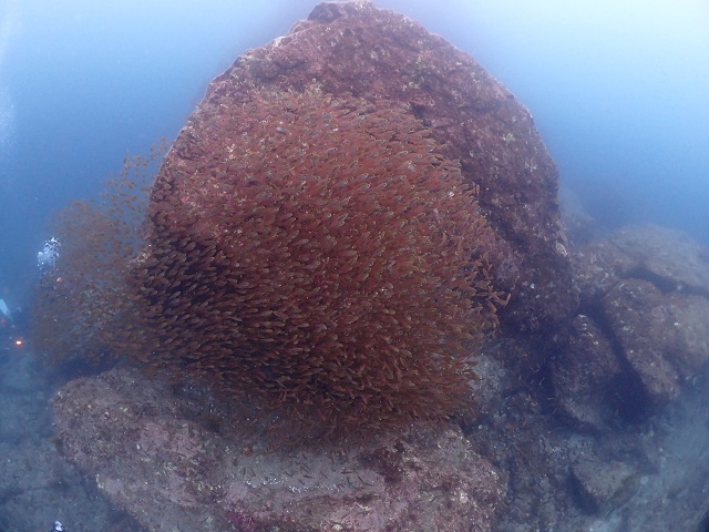 ![]() メジナの群れ すごーい!! よく見ると中にイシガキフグとかハリンセンボン、隠れてる時あるので要チェックです(^-^) |