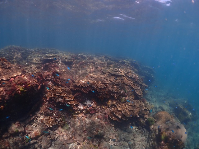 ![]() 少し落ち着いたビーチでは、テーブルサンゴの群生も! ソラスズメダイの青と、太陽の光のシャワーもキレイでしたね〜(^-^) |