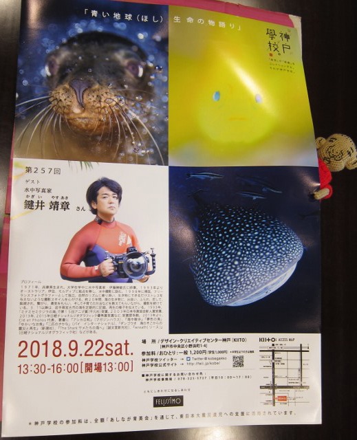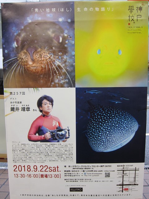 | 2018年9月10日(月) 9月22日(土) 神戸学校に鍵井さん来たる!! 本日、こんなポスターがお店に届きました~! 『神戸学校』というのは、フェリシモさんが主催している「神戸発 生活デザイン学校」で、 色々な方を招いて、講演会を開催しているそうなのですが、 9月22日(土)は、水中写真家の鍵井さんが来られるんですよ~! 13:30~16:00 デザイン・クリエイティブセンター神戸(KIITO)にて開催されますので、 ご予定が空いている方や興味のある方はぜひぜひ行ってみてくださいね! 詳しくは、こちらのHPをご覧ください!⇒神戸学校 お申込手続もネットからできますよ!定員になり次第、締め切りとなるようですので、 ぜひ行きたい!という方はお早めにお手続きくださいね! ![]() 今日は、週末のログもアップしました! 大きな台風の後でしたが、海は着々と元気になってきております! ![]() 明日は定休日です!先週は台風で缶詰だったので、晴れ予報は嬉しいですね(^-^) では、また水曜日にご来店をお待ちしております! |