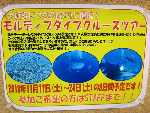 さて、平日日帰りツアーができました!7月25日(水)です! 朝6:30にお店出発で串本へ行きますよ(^-^) 水曜がお休みの方や、その日はお休み~、という方はぜひお問合せ下さい! 宜しくお願いします! ~スペシャルツアー開催のお知らせ~ 2年前 初開催しましたモルディブクルーズツアー ぜひ開催してほしい!!という熱いご要望もあり、 今年も開催することになりました~\(^O^)/ 日程は、 11月17日(土)~24日(土)の8日間の予定です! 23日が祝日なので、土日祝お休みの方は 4日間お休み取っていただければ、夢の国へ行けちゃうんですよ~っ♪ ![]() しかもダイブクルーズのいいところは… ●ずーっと船に乗りっぱなしなのでラクチン♪ ●モルディブの広い範囲で、面白いポイントを丸ごと楽しめる♡ ●朝から晩まで、潜って、食べて、寝て、の最高に幸せな時間の繰り返し~(*^_^*) ある時はジンベイザメと泳ぎ~ ![]() はたまたある時はマンタトレインに遭遇~! ![]() さらにさらに固有種のお魚の群れにも出会えて~ ![]() どこもかしこも群れだらけ~っ♪ ![]() とにかくいいことずくめのモルディブダイブクルーズツアー! ぜひ多くの皆様のご参加をお待ちしております\(^O^)/ 2年前のログはコチラをご覧ください! ![]() ご検討中、という方もひとまずお店までぜひご連絡ください! 宜しくお願いしまーす!! |