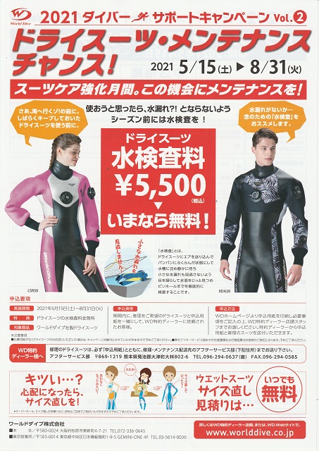 | 2021年5月19日(水) 逃げ恥婚~♪ 今日はちょっとミーハーな話題から(^-^) 驚きの逃げ恥婚のニュース皆様、ご覧になりましたか~? ニュースの速報にあがってきた時には目を疑いましたが、 個人的には、逃げ恥も大好きで、お二人も大好きなので、なんだかほっこりしました(^-^) そういえば、クリスマスパーティーで皆で逃げ恥の恋ダンス踊ったの、懐かしいなぁ~(#^.^#) ![]() ![]() 今調べたら、2016年の12月でした… 時の経つのが早すぎですね(^_-)-☆ またこんな感じでワイワイ大騒ぎできる日常が 一日も早く戻ってきてほしい… そのためにも、皆さん、まずは感染対策、気を抜かず、しっかり頑張りましょうo(^o^)o さて、本題でもないのですが、 本日はスーツメーカー ワールドダイブの営業さんがお越しくださって 先日もちらっとご案内したキャンペーンの案内をいただきました! ![]() キャンペーン期間中、 通常は、5,500円(税込)かかる水検査料が無料になります! ※送料、修理が必要な場合の修理代はかかります。 コロナでしばらく潜れそうにないなぁ…という方や ウェットシーズンの間に調べておこうかなぁという方、 8月末までになっていますので、 ぜひこの期間にドライスーツ万全にしておいてくださいね~!! それでは、明日から明後日にかけては結構雨が降る予報… 皆様、くれぐれも足元にはお気をつけて! |